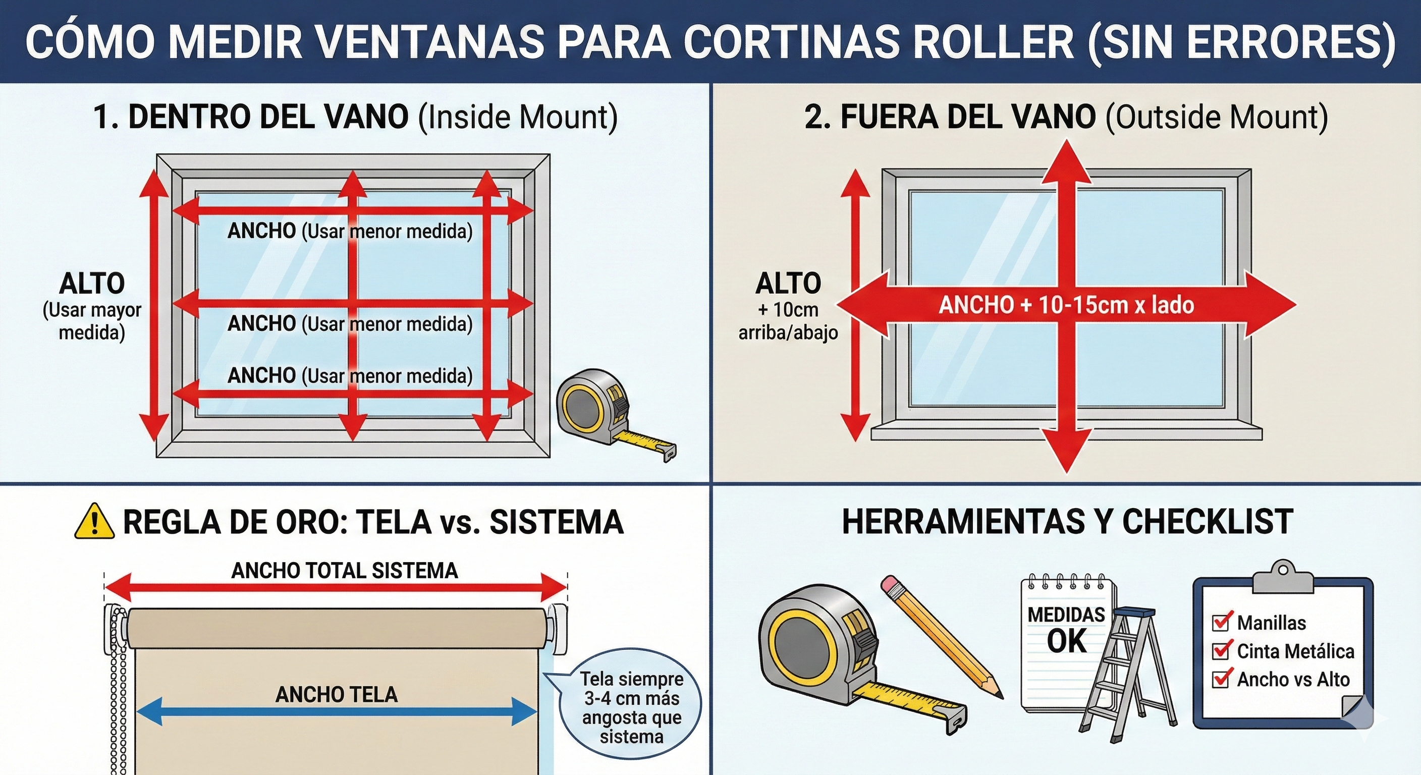 El primer paso para disfrutar de unas cortinas roller perfectas no es elegir el color, sino tomar las medidas exactas. Una medición correcta garantiza que la instalación sea sencilla y que el resultado final se vea profesional y elegante.